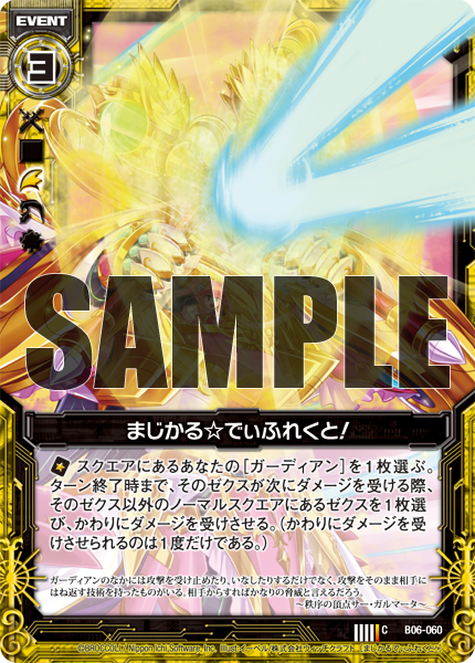 ・スクエアにあるあなたの「ガーディアン」を1枚選ぶ、ターン終了時まで、そのゼクスが次にダメージを受ける際、そのゼクス以外のノーマルスクエアにあるゼクスを1枚選び、そのかわりにダメージを受けさせる(かわりにダメージを受けさせられるのは1度だけである。)